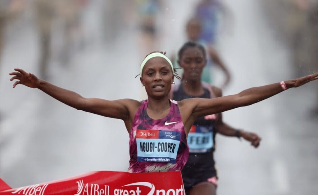 Ngugi-Cooper luôn trong nhóm dẫn đầu từ vạch xuất phát. Ngugi-Cooper was joined from start to finish by fellow gồm các chân chạy lừng lẫy như Sheila Chepkirui, Vivian Cheruiyot, Senbere Teferi và Megertu Alemu của Ethiopia cùng chân chạy bán marathon số 1 nước Anh Eilish McColgan. Nhóm này bám đuổi nhau cho đến gần cuối cuộc đua khi cô vượt qua Senbere Teferi nhờ màn nước rút ngoạn mục. Thời tiết mưa nhưng chân chạy 35 tuổi vẫn về đích đầu tiên với thời gian 67:40, trở thành người Kenya thứ 11 vô địch giải nữ. Ngugi có mối liên hệ chặt chẽ với nước Anh khi cô đang sống ở Leeds cùng chồng.